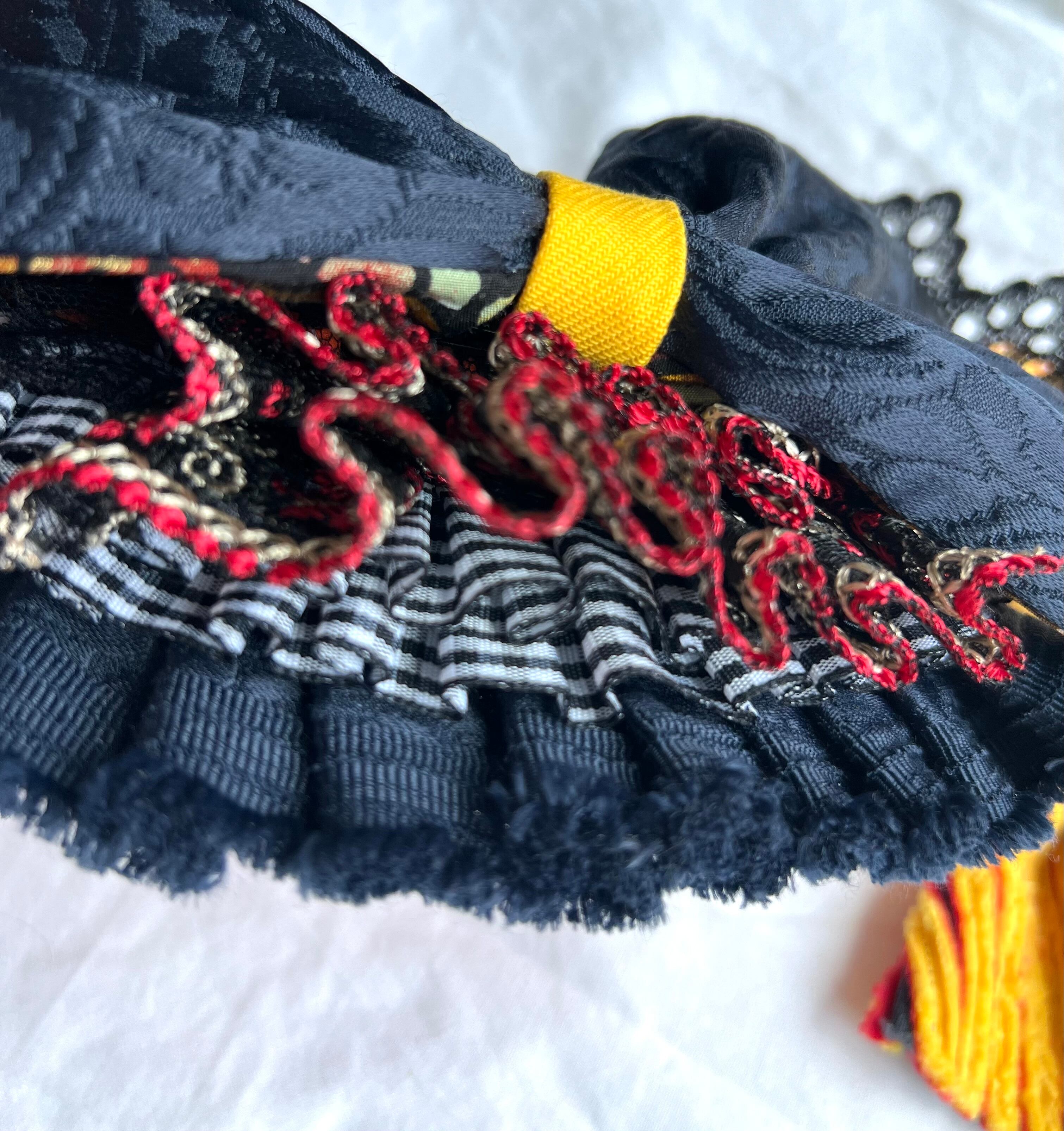 デニムとスラッシュキルトで作ったリボンに、裏地がド派手な紺のリボン