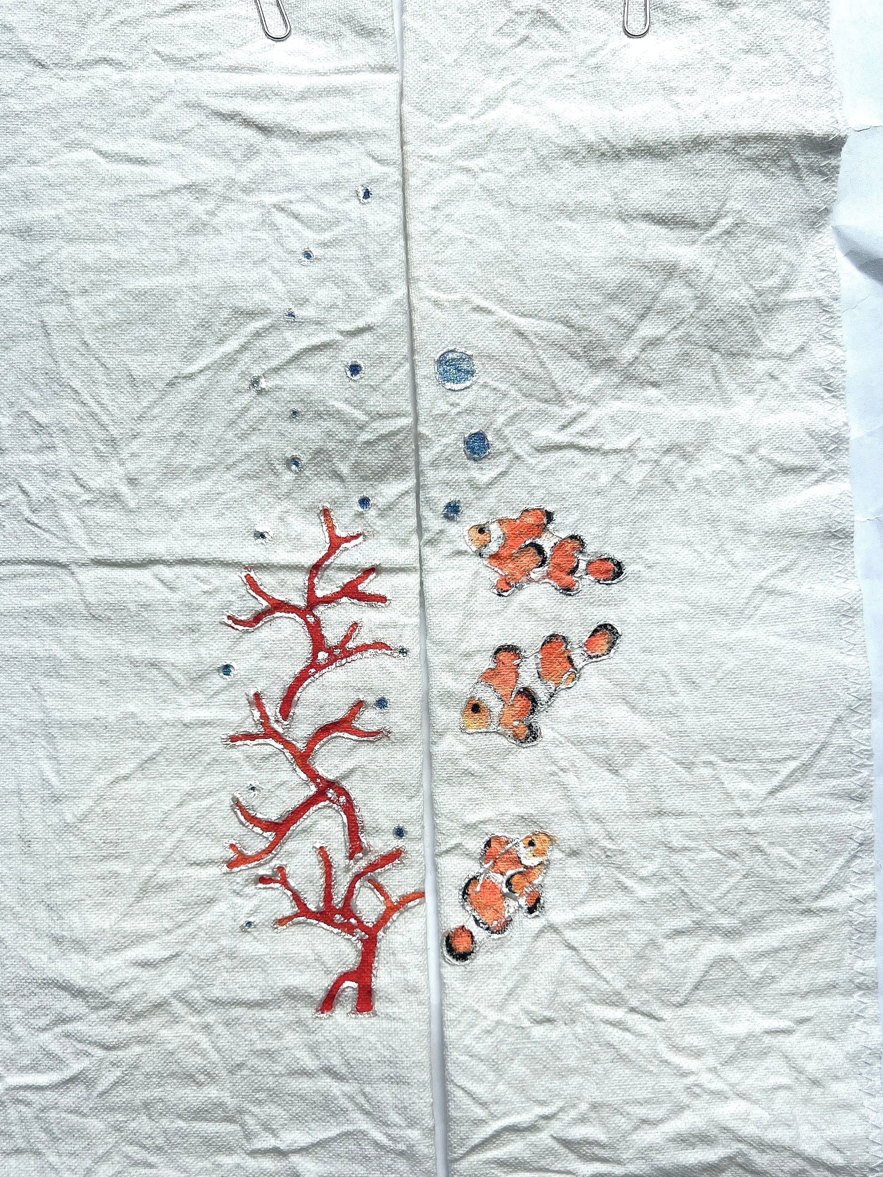 綿麻混合布に絵付けしました。発色が良き仕上がりです。お手入れ方法はつけおき洗いがおすすめです。