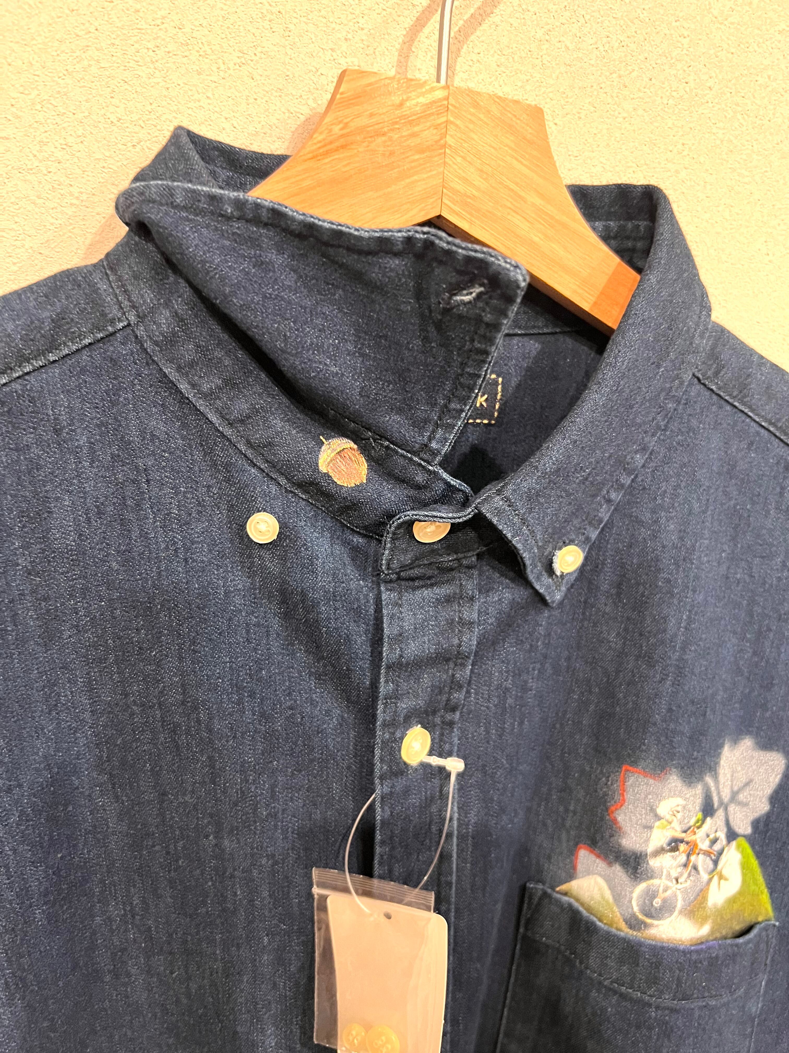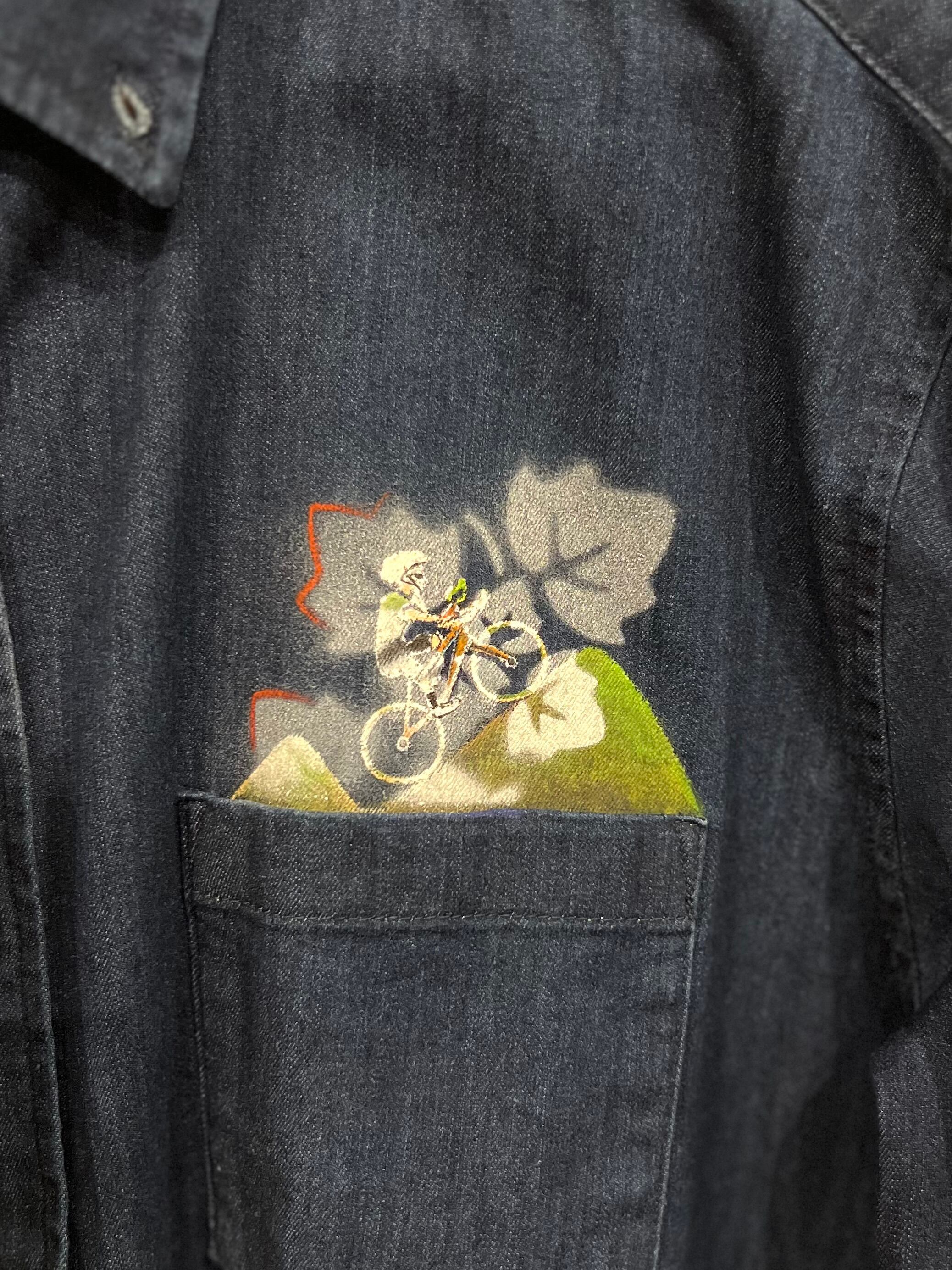 ロードバイク関連のイラストは布絵具(洗濯可能)で絵付けしました。1点もののオリジナルデニムシャツです。