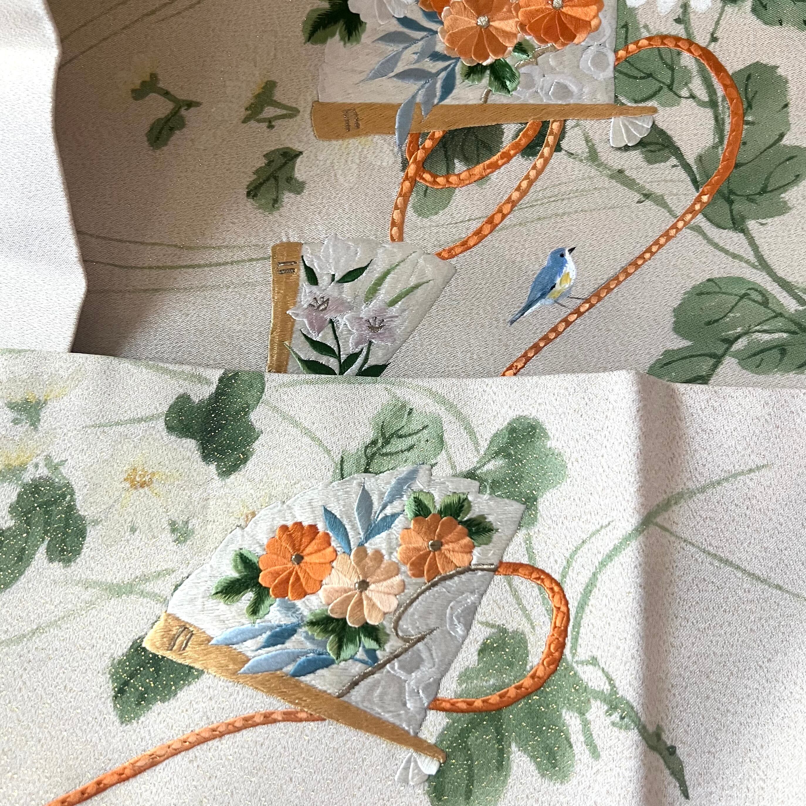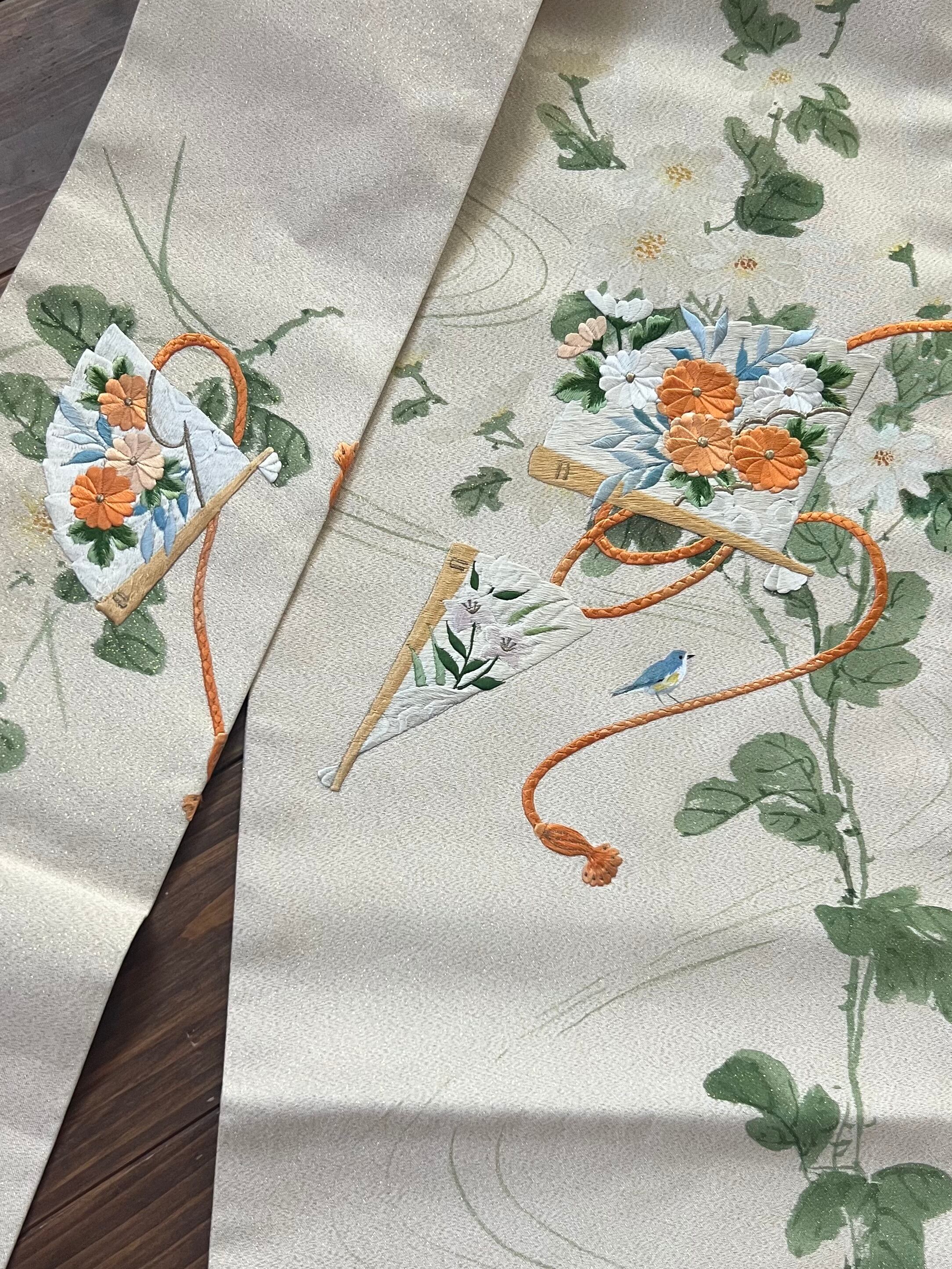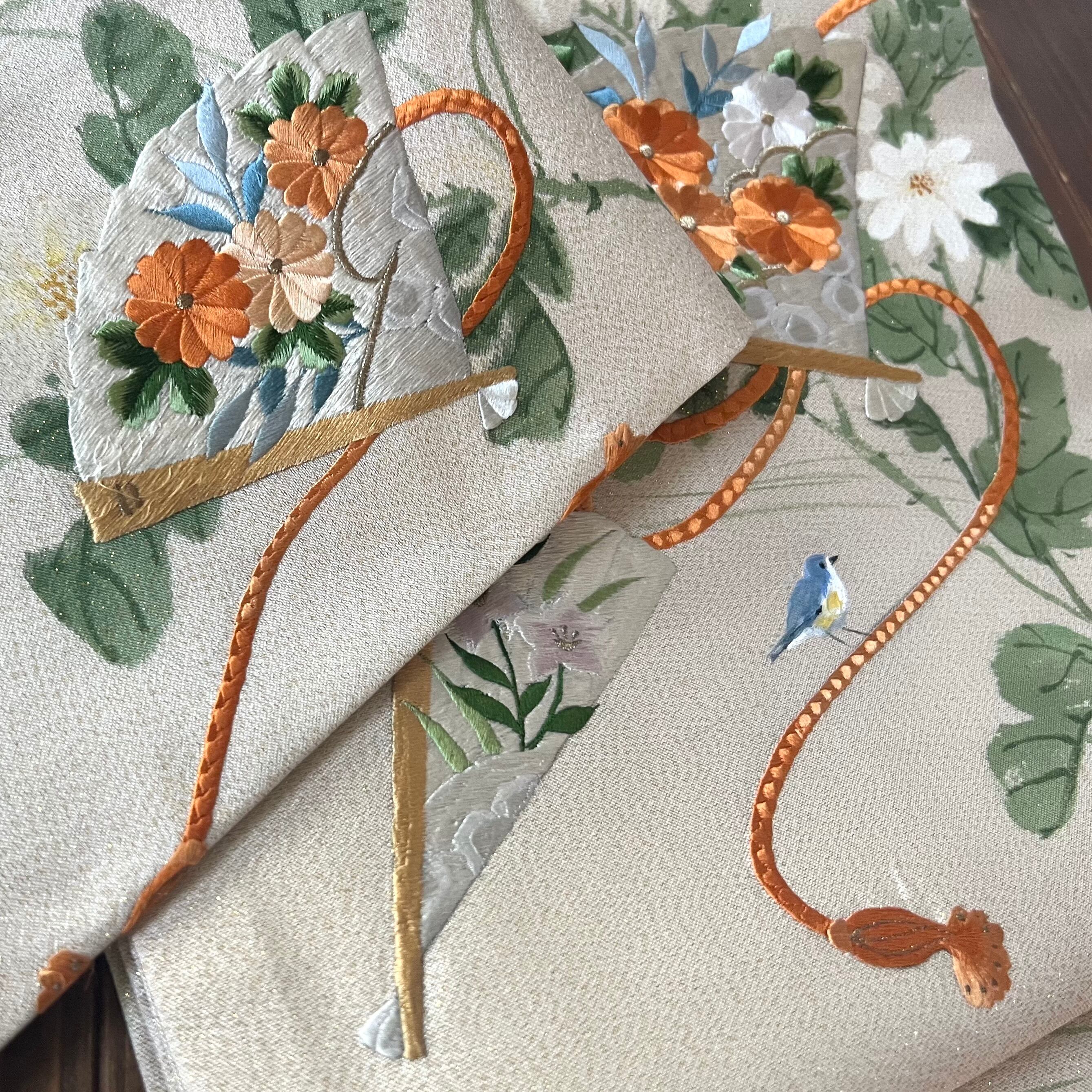 汚れ箇所は、葉を描き足して殆ど分からないと思います。古典的な柄だけど、可愛い小鳥も足して、ワンポイントの素敵な帯になりました。