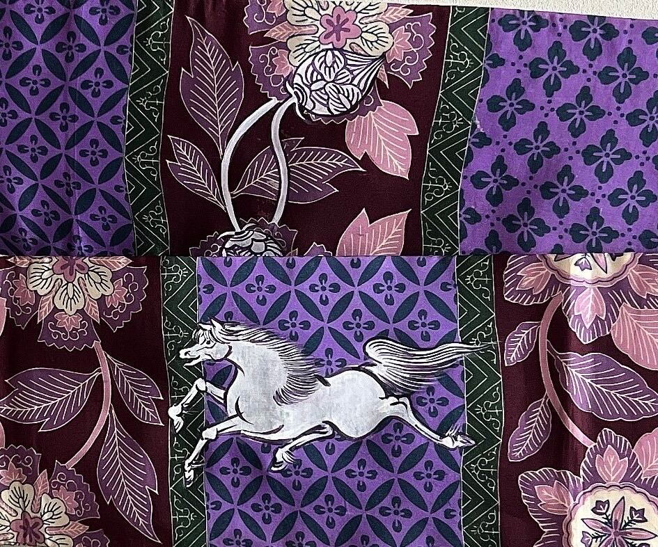 アンティーク生地の半幅帯の汚れ部分に馬などを絵付けしました。
