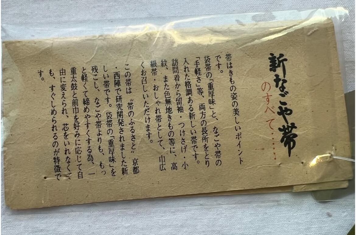 画像6枚目帯についていた説明文ですが、芯なしの状態でも割としゃきっとしていて綺麗なお太鼓が出来そうです。また、非常に軽く地色も綺麗なお品となります。