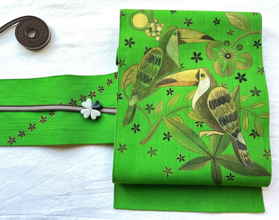 はっきりと月や星のモチーフをお太鼓に描いていませんが、月夜に照らされたオオハシをイメージしています。