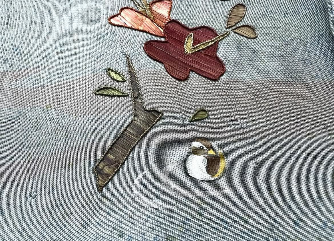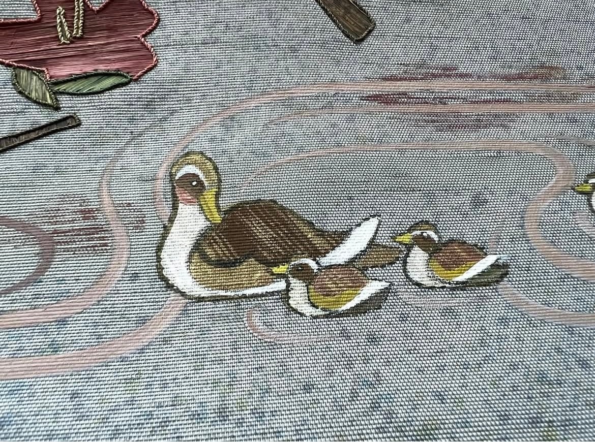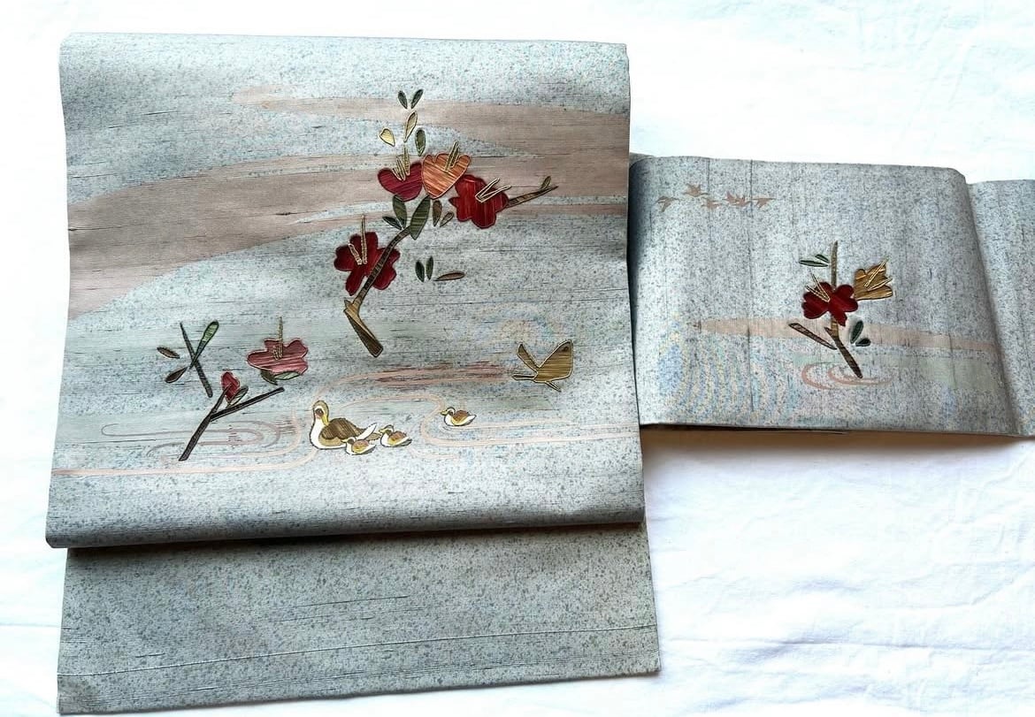 変わった素材で花の刺繍がある名古屋帯にカルガモ親子、流水などを絵付けしました。